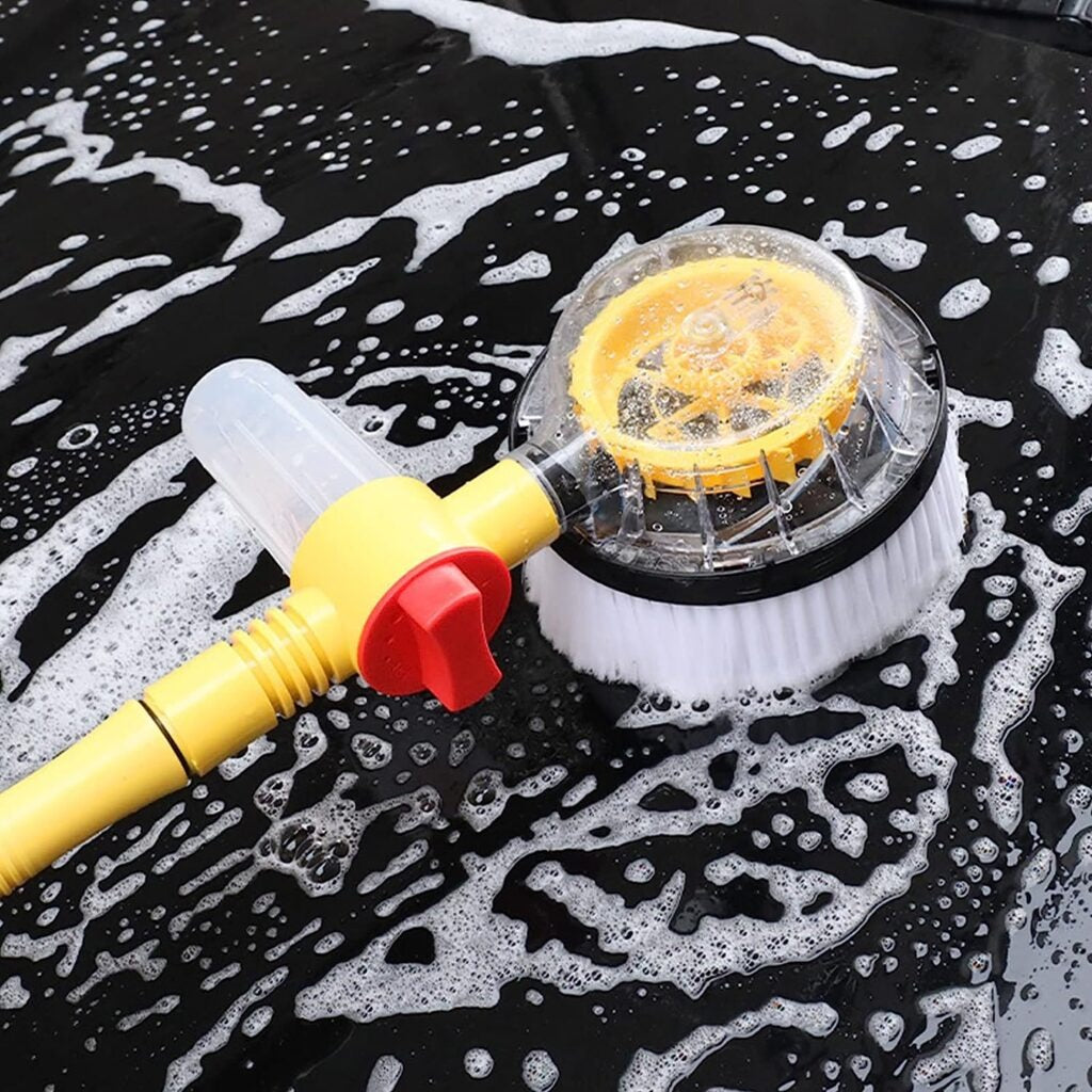 Solo conecta el cepillo al grifo y deja que la presión del agua active su sistema giratorio, generando abundante espuma mientras frota suavemente la superficie. Elimina suciedad, barro y manchas sin dañar la pintura, ofreciendo un resultado similar al de un lavado profesional, sin necesidad de electricidad.