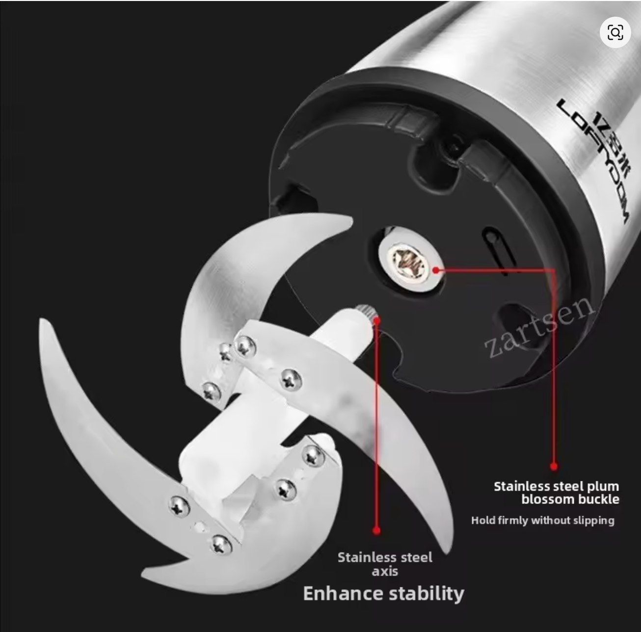 - Cuchillas de cuatro hojas: Corte uniforme y eficiente desde todos los ángulos.